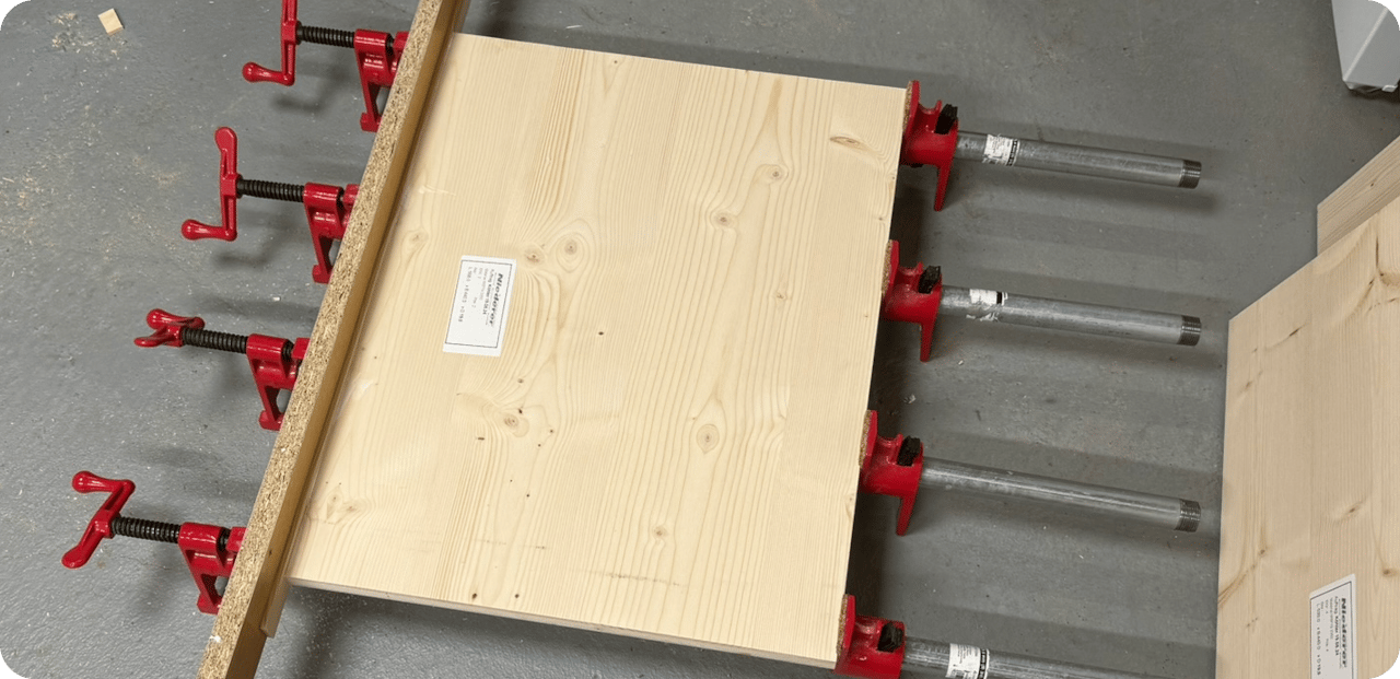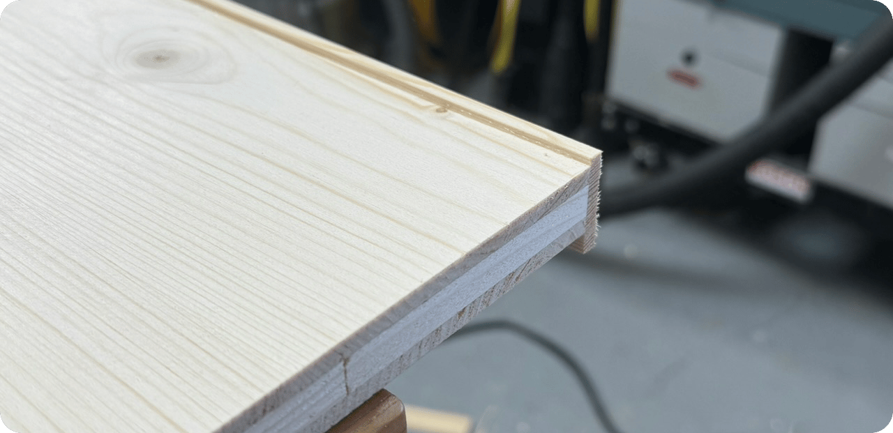 Als Material habe ich eine Dreischicht Platte aus Fichte / Tanne genommen und 5mm starke Leisten als Umleimer verwendet. Die Platten haben eine Stärke von 19mm, die Leisten 25mm. Das macht das Verleimen sehr viel einfacher, weil man nicht aufpassen muss das alles bündig sitzt.