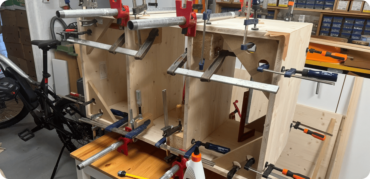 Natürlich ist diese Methode aufwändiger als wenn man gleich 19mm Leisten verwendet, aber ich finde so wird das Ergebnis viel sauberer, und man muss, wie bereits erwähnt, beim verleimen nicht so aufpassen. Falls es dich interessiert wie ich die Vorrichtung gebaut habe, das Video dazu findest du hier: