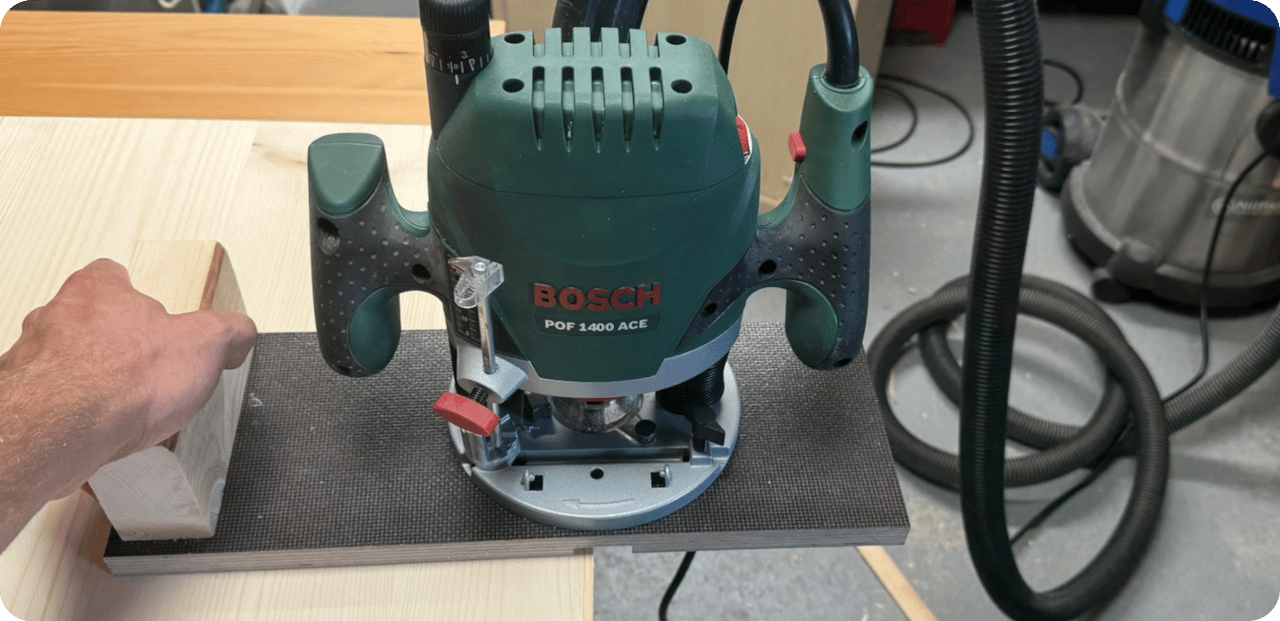 Den Überstand hab ich dann einfach weggefräst. Dazu habe ich vor einiger Zeit eine Vorrichtung gebaut. Das hat sehr gut funktioniert, aber ausgerechnet bei der letzten Leiste ist dann etwas ausgebrochen. Das war aber auch keine Tragik, einfach die komplette Leiste mit der Tauchsäge weggeschnitten und eine neue angeleimt.